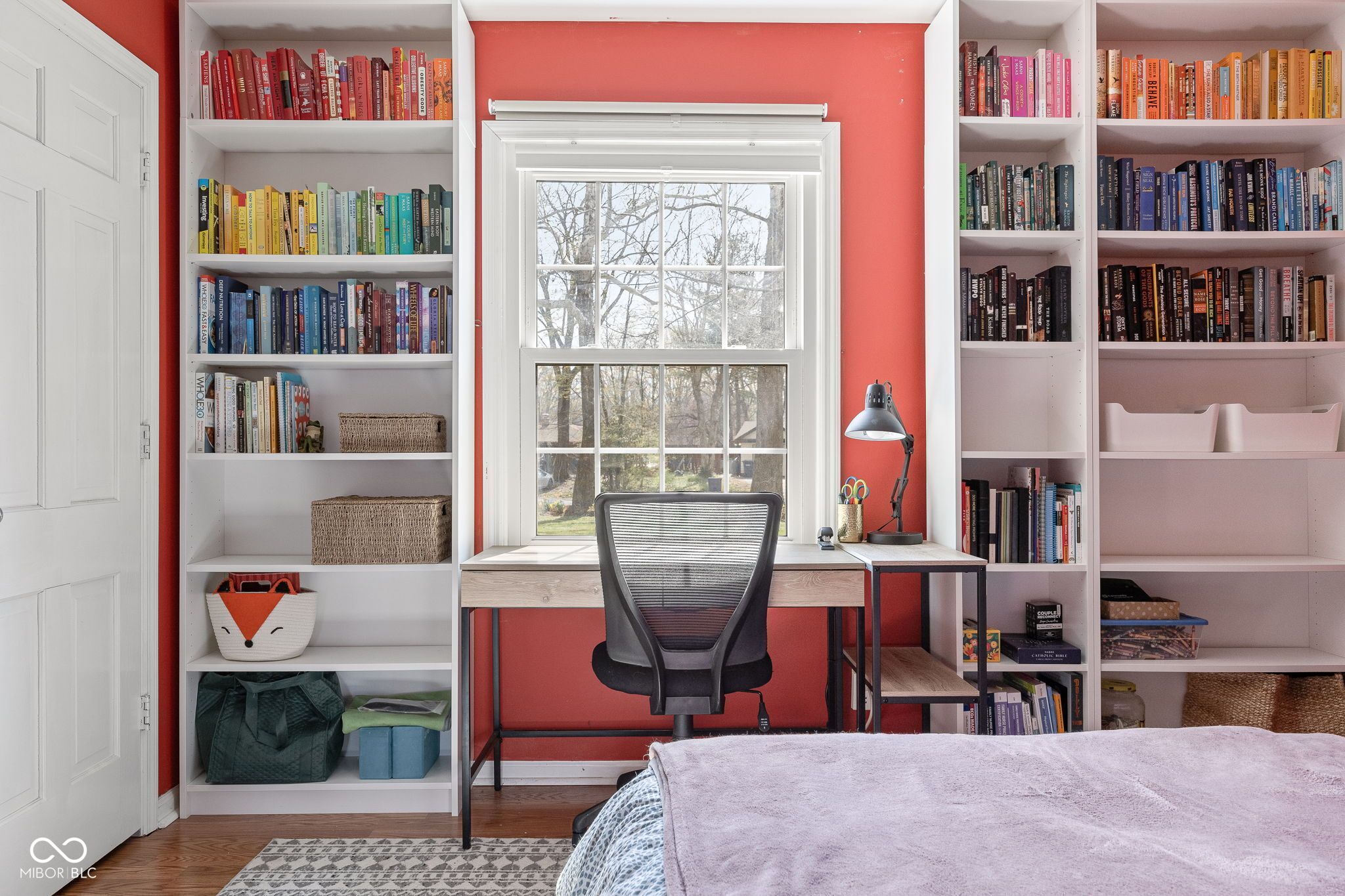 Tucked into one of the most picturesque settings in Carmel, this rare property offers a truly magical backdrop with ever-changing seasonal beauty. Enjoy the feel of peaceful, rural living without giving up the convenience of being in the heart of Hamilton County and within highly regarded Carmel Clay Schools. The outdoor spaces are a standout feature, with mature trees, a gentle stream, and multiple areas to relax or entertain including a welcoming covered front porch and two decks overlooking the private backyard. Enjoy entertaining in the light and bright Kitchen with white subway tile and stainless steel appliances. The family room features a fireplace, built-in bookshelves, and a wall of windows providing serene views to be enjoyed all year long. The primary suite is a true retreat, highlighted by a vaulted ceiling, its own fireplace, and a private balcony. The en-suite bath offers dual vanities and a walk-in closet. Upstairs, the second bedroom also includes a walk-in closet and direct access to a full bath. On the main level, a flexible fifth bedroom with built-in bookshelves provides the ideal setup for a home office, guest space, or creative studio. Major updates add peace of mind, including newer windows, HVAC (2023), water heater (2020), refrigerator (2021), and water softener (2022). Additional improvements such as gutter guards, some updated plumbing, and garage door springs. This is a unique opportunity to own a home that blends natural beauty, thoughtful updates, and an unbeatable location-offering the best of both privacy and proximity.